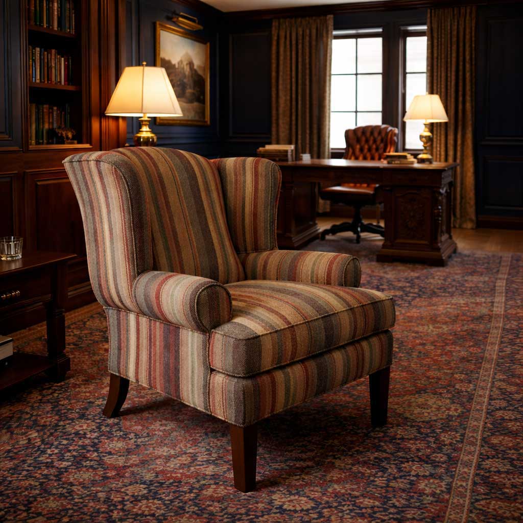 Jodphur wing chair with traditional yet contemporary feel, based on a chair in our favourite hotel in Rajasthan, this one has a feather and down seat and fixed back. Shown here in the extra large size, covered in Warwick Smythson wool stripe, it has straight beech legs in medium oak and can be ordered with alternative straight or turned legs. Available in a choice of leathers and fabrics - choice of over 2000 references - fabrics offered may vary according to availability.
